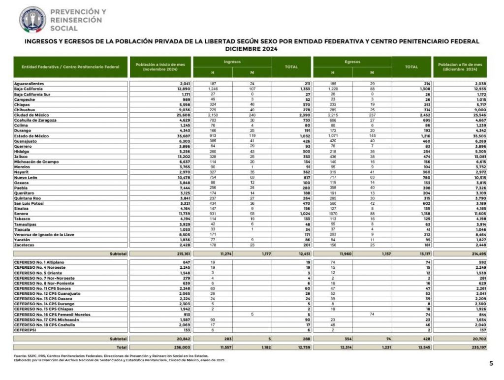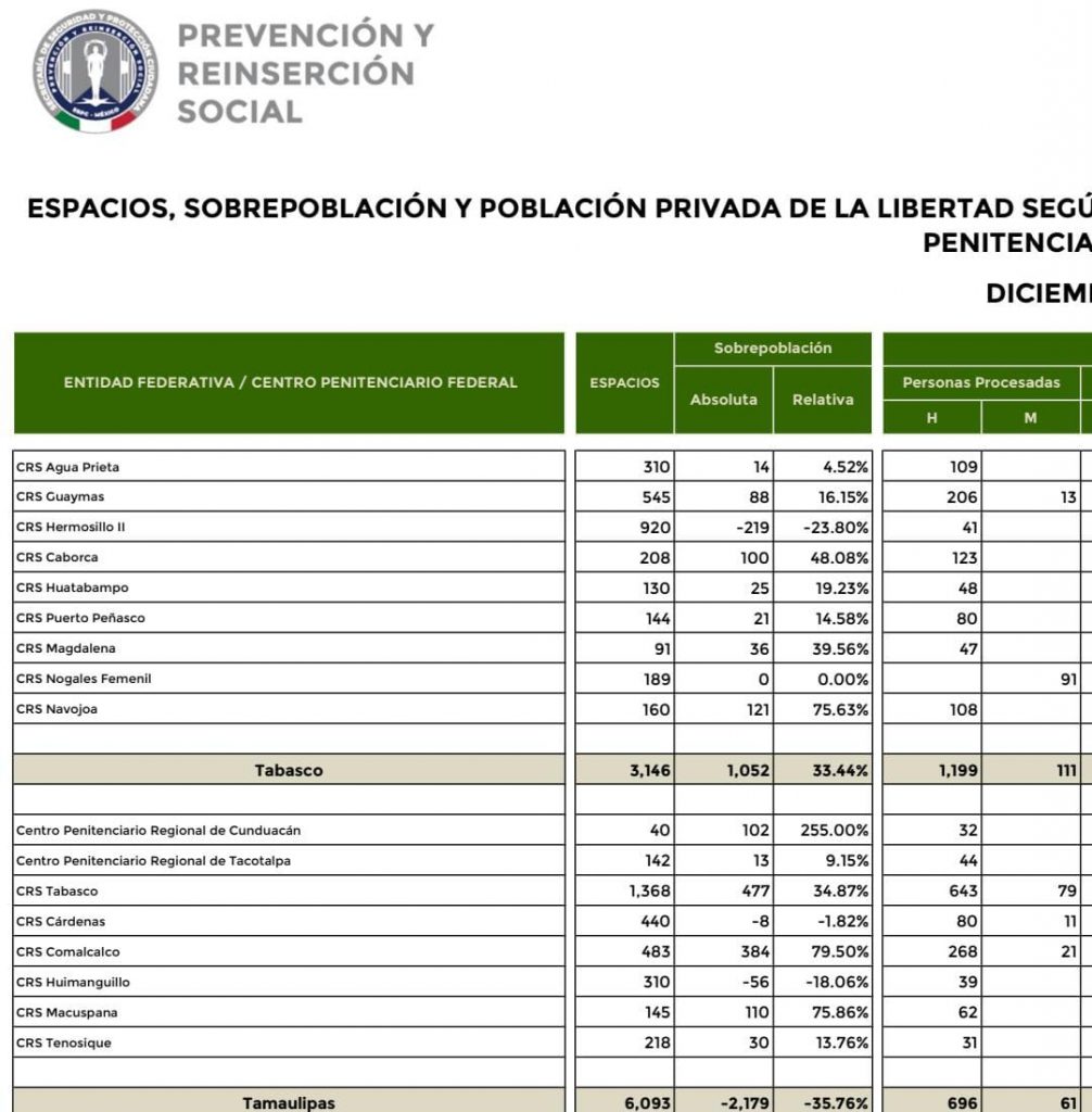 El Creset, de acuerdo a la gráfica oficial de la dirección Prevención y Reinserción Social, en el cuaderno mensual de información estadística penitenciaria nacional, con fecha de diciembre del 2024, señala: