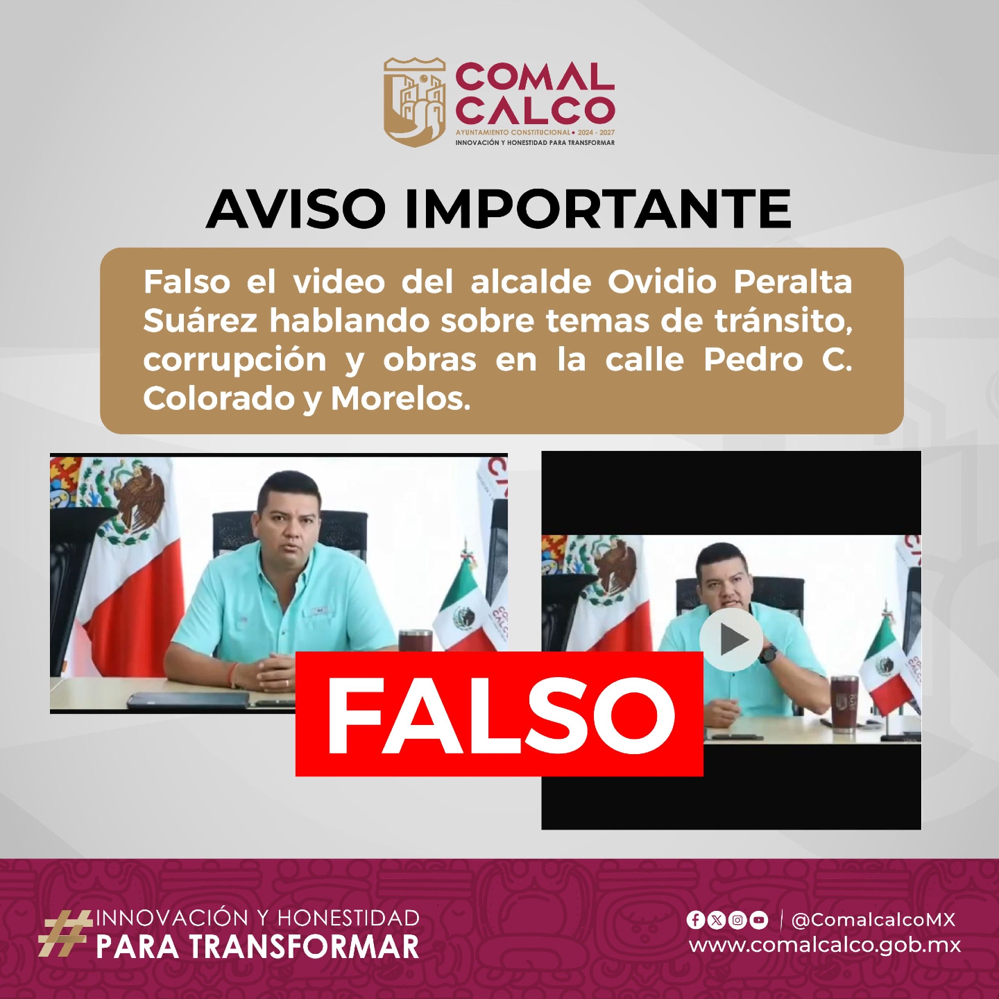 El Ayuntamiento de Comalcalco informó que es falso el video que circula en redes sociales donde aparenta hablar el presidente municipal Ovidio Peralta Suárez sobre temas de tránsito, corrupción y obras públicas.