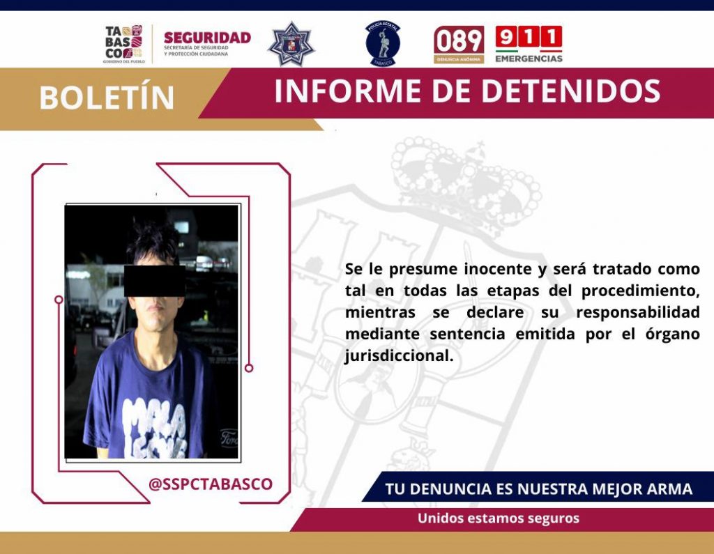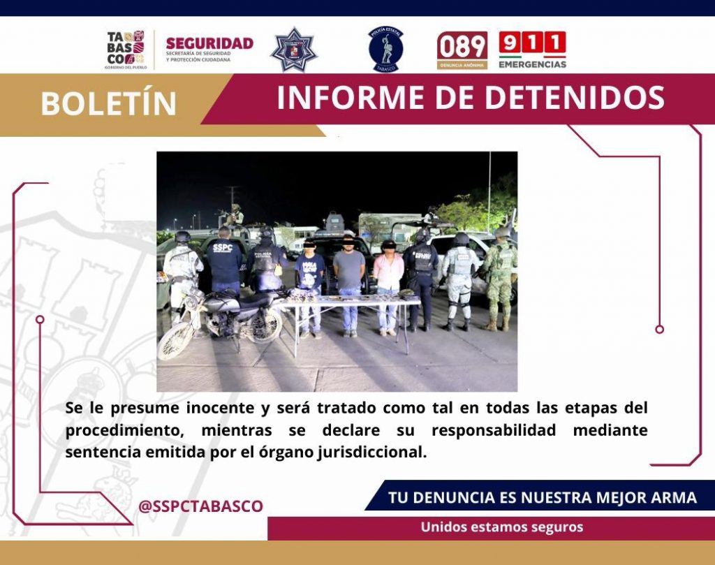 La detención se llevó a cabo en la calle Principal de la ranchería Torno Largo, en el municipio de Centro, donde fueron asegurados Heriberto “N”, Camilo “N” y Enrique “N”.