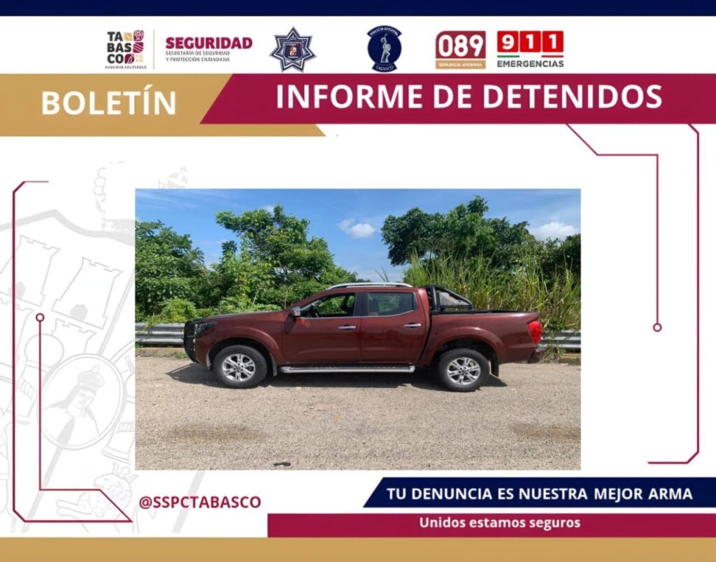 El detenido fue identificado como Martín Esteban “N”, de 41 años de edad, quien circulaba sobre la carretera Villahermosa–Escárcega, a la altura de la localidad de Medellín y Pigua, donde fue asegurado un vehículo Nissan NP300 presuntamente relacionado con el ilícito.
