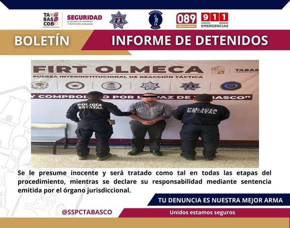 La Secretaría de Seguridad y Protección Ciudadana (SSPC) informó que se mantienen activos los recorridos preventivos en coordinación con la Secretaría de la Defensa Nacional, la Secretaría de Marina, la SSPC de México, la Fiscalía General de la República (FGR), la Guardia Nacional y la Fiscalía General del Estado, con el objetivo de fortalecer la seguridad y reducir la incidencia delictiva en todo el territorio tabasqueño.