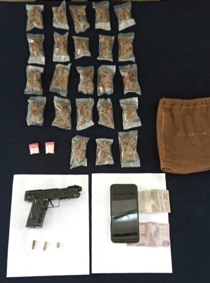 Sin embargo, fue alcanzado y al efectuarle una inspección, le fueron encontradas un arma de fabricación casera calibre 22, así como 23 dosis de hierba seca con características de la marihuana y dos dosis de una piedra granulosa similar a la cocaína.