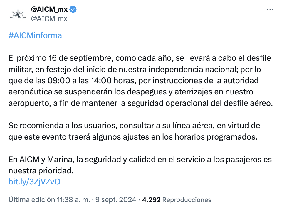 El Aeropuerto Internacional de la Ciudad de México (AICM) informó que suspenderá despegues y aterrizajes el 16 de septiembre, de 9:00 a 14:00 horas, por el 214 aniversario de la Independencia de México. La medida permitirá realizar maniobras aéreo-militares durante el desfile conmemorativo, de acuerdo con un aviso de la Agencia Federal de Aviación Civil (AFAC).