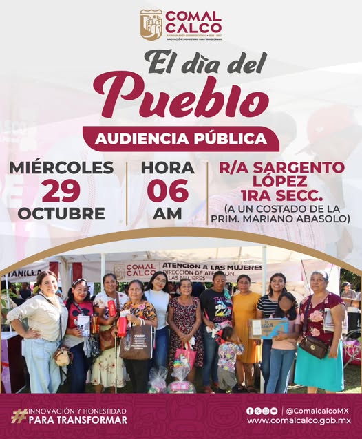 El Ayuntamiento de Comalcalco, que encabeza el alcalde Ovidio Peralta Suárez, invita a las y los habitantes de la Ranchería Sargento López 1ra. Sección a participar en una nueva jornada del programa “El Día del Pueblo”, que continúa acercando servicios y atención directa a las comunidades del municipio.