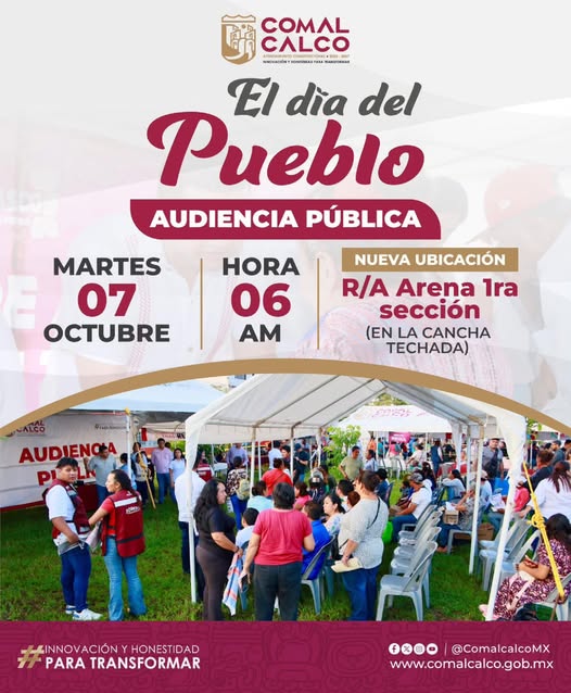 El programa El Día del Pueblo sigue acercando servicios y beneficios a las comunidades del municipio. En esta ocasión, el Ayuntamiento de Comalcalco invita a las y los habitantes de la R/A Arena 1ra. Sección a participar en esta jornada de atención directa encabezada por Ovidio Peralta Suárez, en coordinación con las dependencias municipales.