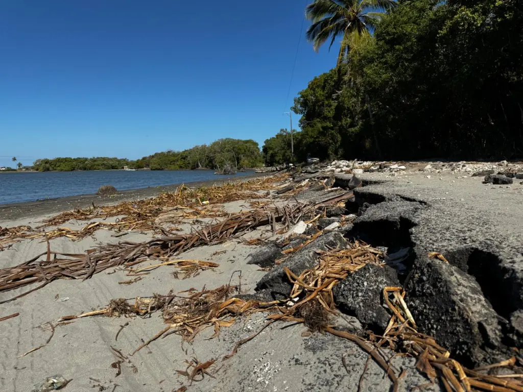 Un recorrido reciente por la zona confirma lo evidente: el mar no se detiene. Aunque en 2025 se concretó la reubicación de las familias tierra adentro —un hecho reconocido como el primer caso oficial de desplazamiento climático en el país—, en el sitio original aún permanecen algunas estructuras en pie, como vestigios de lo que fue una comunidad viva y productiva.