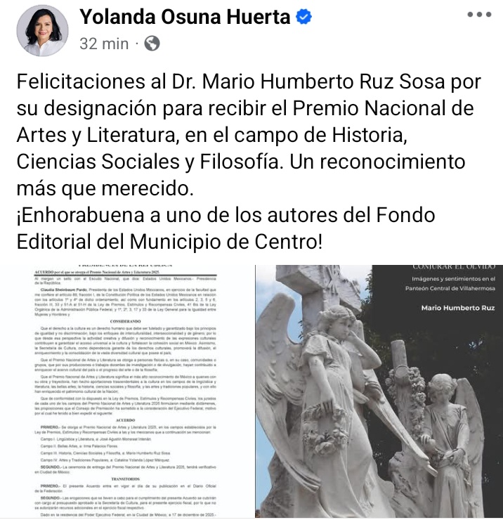 La presidenta municipal de Centro, Yolanda Osuna Huerta, expresó una felicitación pública al Dr. Mario Humberto Ruz Sosa por su designación como galardonado con el Premio Nacional de Artes y Literatura, en la categoría de Historia, Ciencias Sociales y Filosofía.