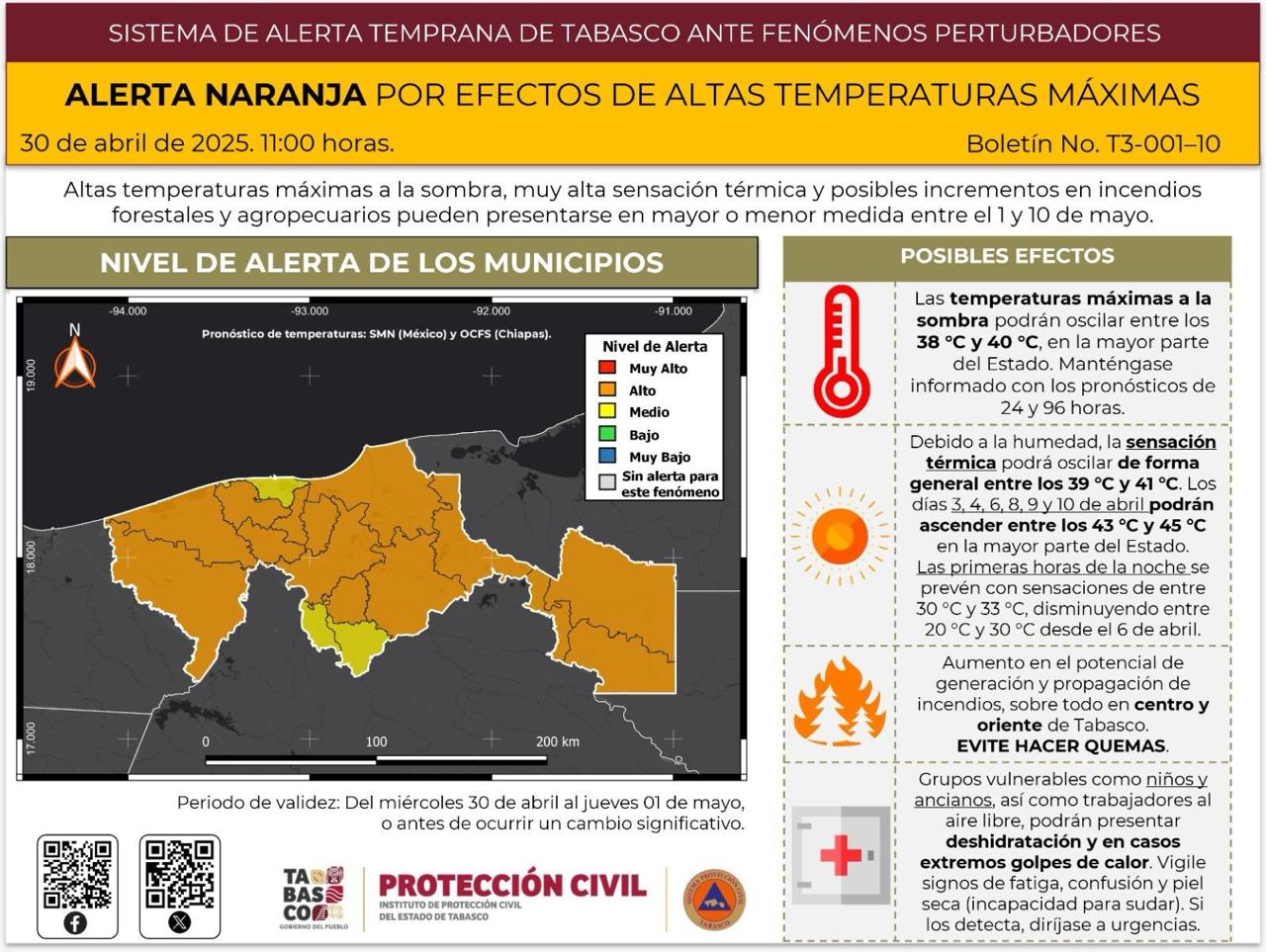 Villahermosa, Tab.- El Instituto de Protección Civil del Estado de Tabasco (IPCET) emitió una alerta naranja debido a los efectos que se esperan ante una onda de calor que podría afectar a la entidad en los primeros 10 días del mes de mayo y que generaría temperaturas entre los 38° C y 40°C a la sombra.
