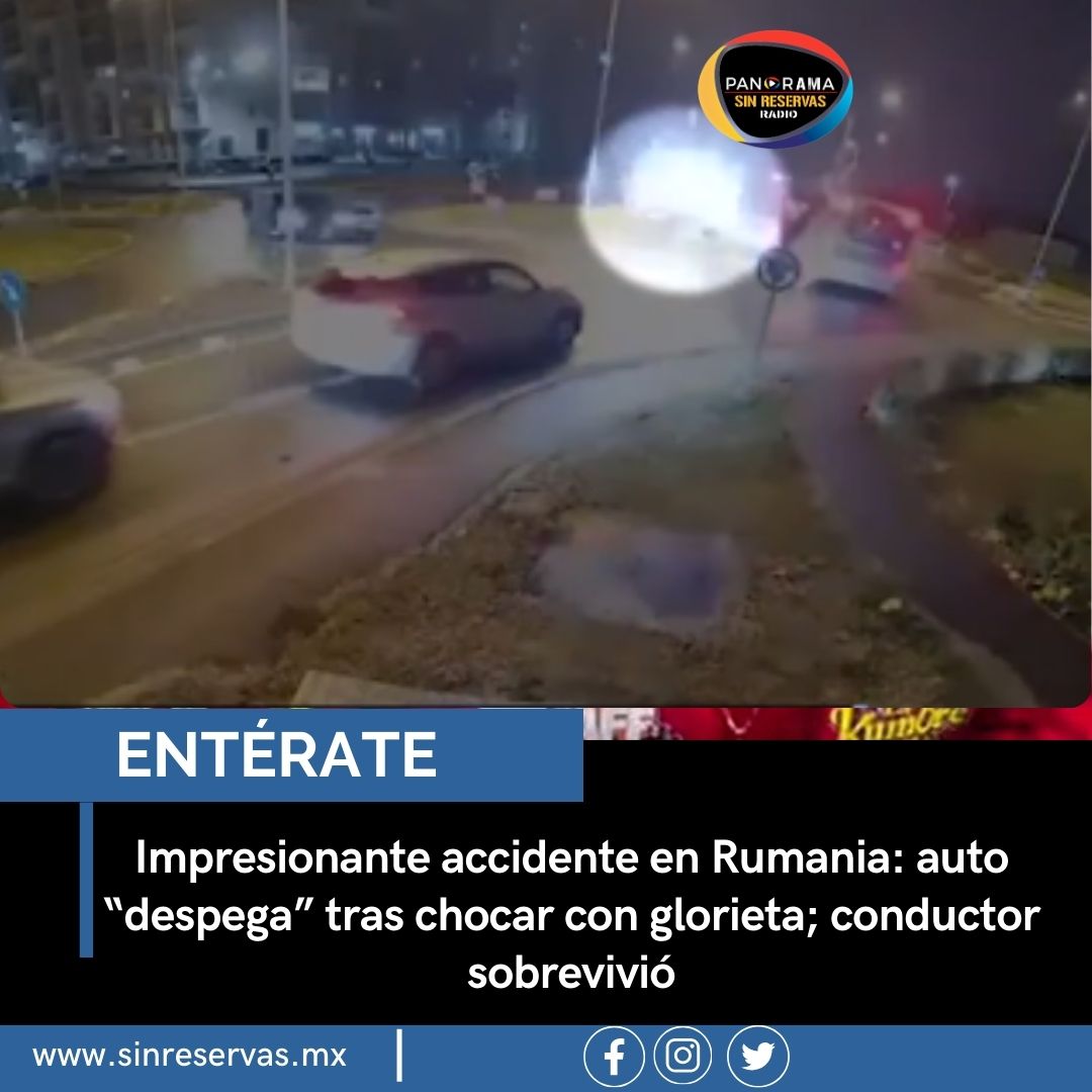Imágenes impactantes captadas en Oradea, Rumania, muestran el momento exacto en que un automóvil salió proyectado por los aires después de impactar contra una glorieta, terminando en la banqueta del carril contrario.