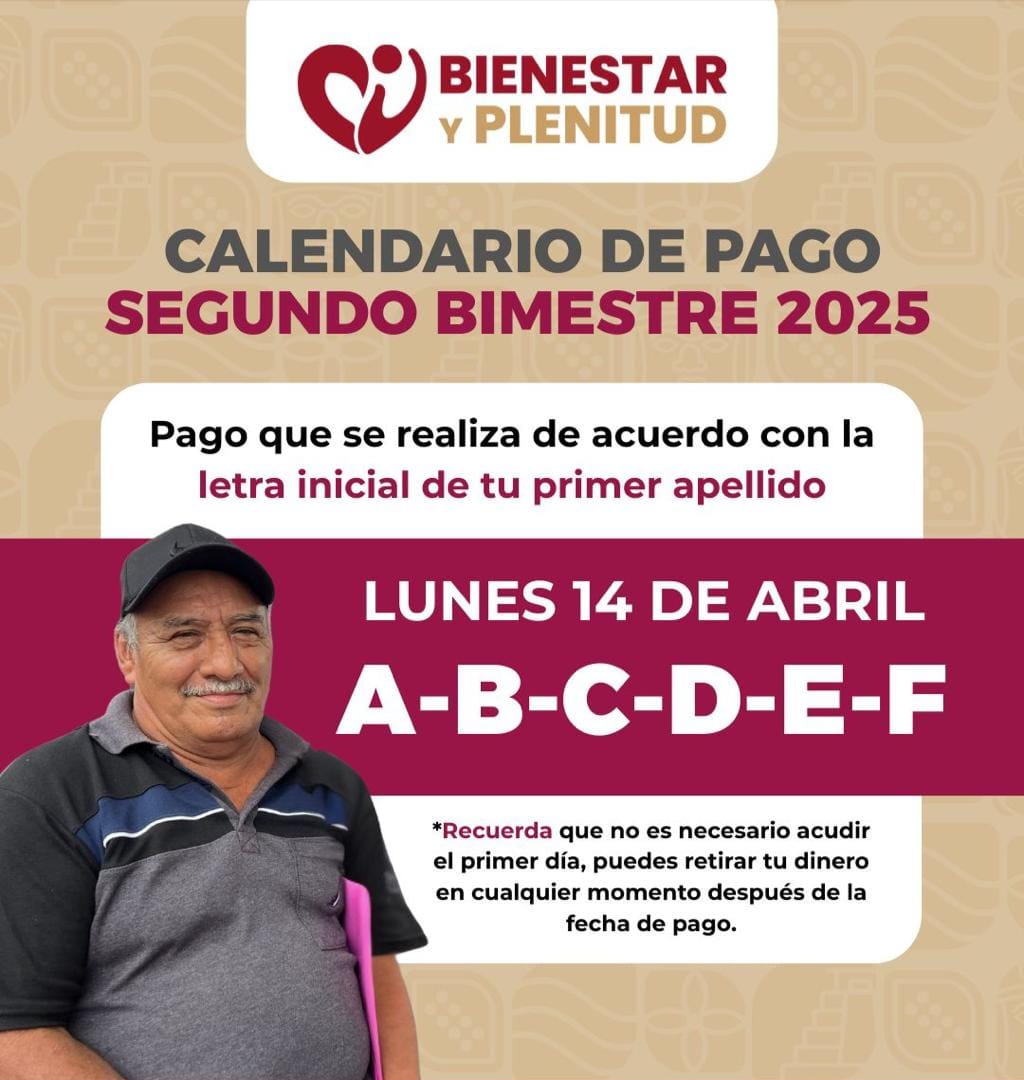 El segundo pago de la Pensión Bienestar y Plenitud se distribuirá de forma escalonada según la primera letra del apellido paterno de cada beneficiario, de la siguiente manera: