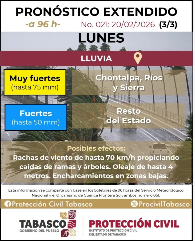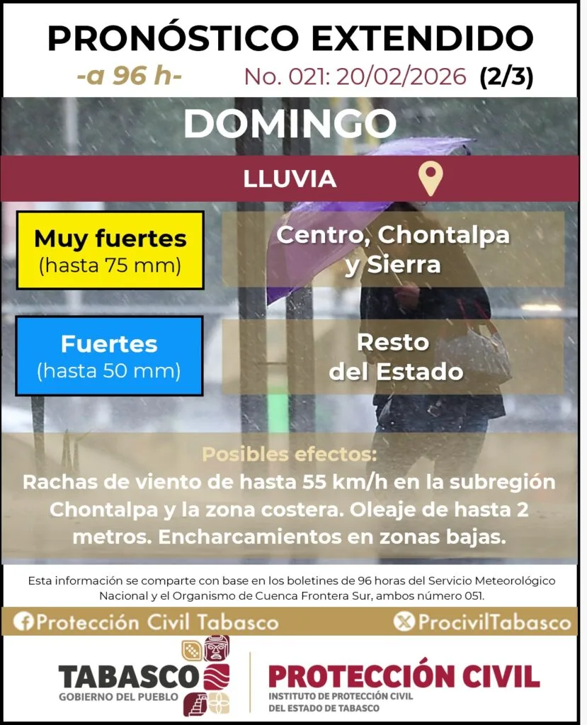 Además, se prevé un evento de “Norte” con rachas de viento de 50 a 70 km/h durante la noche del domingo y la madrugada del lunes, así como oleaje elevado de hasta 4 metros en zonas costeras.