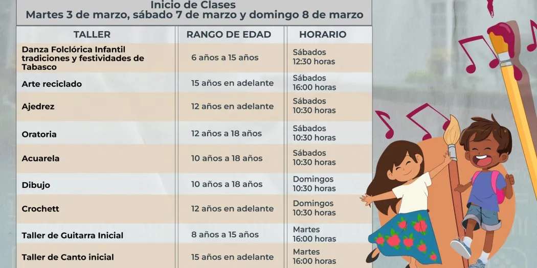 Las clases iniciarán los días 3, 7 y 8 de marzo, con una oferta diversa que incluye danza, música, artes plásticas, ajedrez y expresión oral, fortaleciendo así el acceso a la cultura en uno de los espacios emblemáticos del estado.