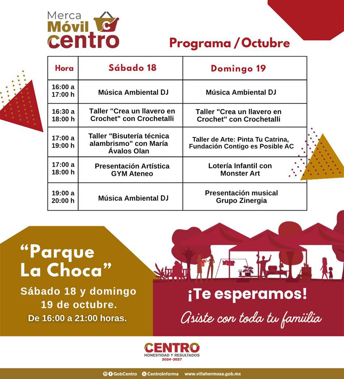 Este sábado 18 y domingo 19 de octubre, la familia y la comunidad están invitados a disfrutar de un fin de semana diferente con Merca Móvil Centro, que se instalará en el Parque La Choca ofreciendo actividades para todas las edades.