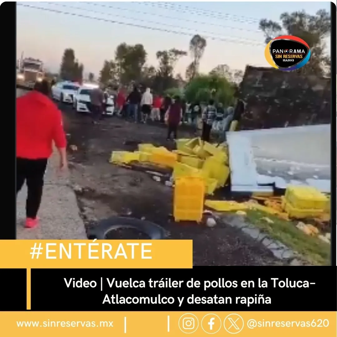 Un tráiler cargado con pollos volcó sobre la carretera Toluca–Atlacomulco, lo que provocó que pobladores de la zona se acercaran para llevarse la mercancía en medio del accidente.
