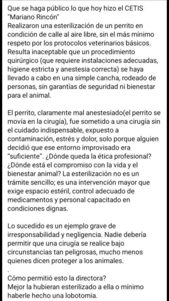 Lo ocurrido en el CETIS “Mariano Rincón”, en el estado de Veracruz, ha generado una fuerte indignación entre defensores de los animales y la comunidad en general. En el plantel se practicó una esterilización a un perro en situación de calle al aire libre, sin cumplir con las condiciones mínimas de higiene, seguridad ni bienestar animal.