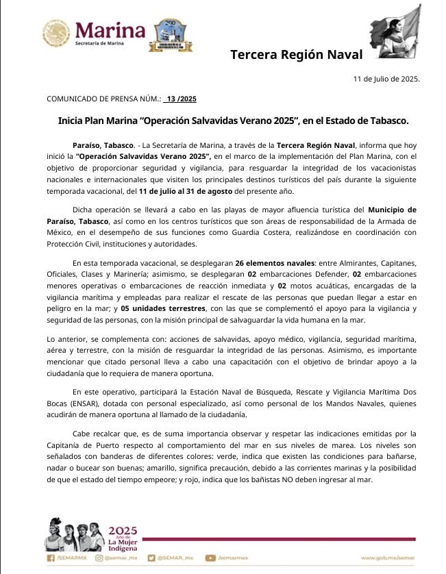 Paraiso, Tabasco.- La Secretaría de Marina, a través de la Tercera Región Naval, informa que hoy inició la “Operación Salvavidas Verano 2025”, en el marco de ta implementarión del Plan Marina, con el objetivo de proporcionar seguridad y vigilancia, para resguardar la integridad de los vacacionistas nacionales e internacionales que visiten los principales destinos turísticos del país durante la siguiente temporada vacacional, del 11 de julio al 31 de agosto del presente año.