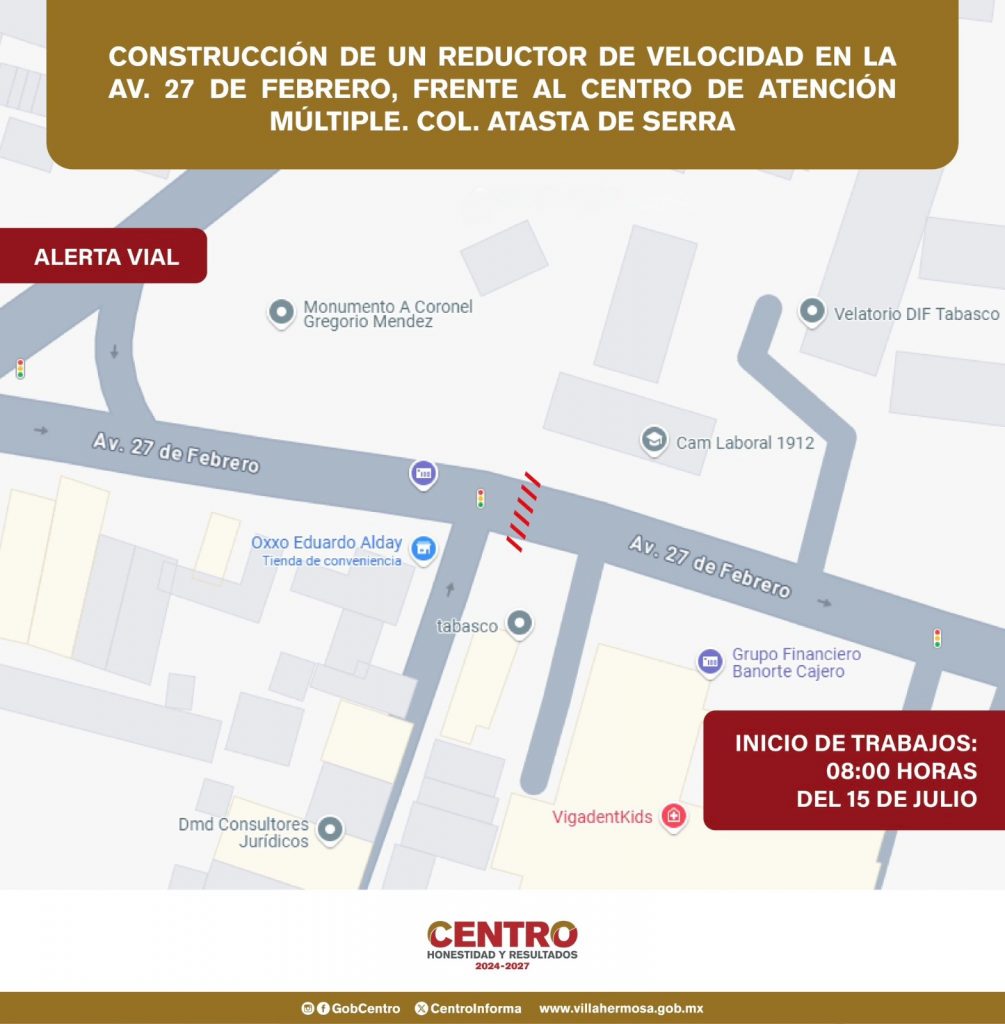 Villahermosa, Tabasco, 12 de julio de 2025.- A partir de las 08:00 horas del martes 15 de julio, se llevarán a cabo trabajos para la construcción de un reductor de velocidad sobre la avenida 27 de Febrero, a la altura del Centro de Atención Múltiple, en la colonia Atasta de Serra.