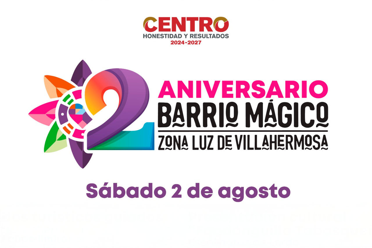 El Gobierno de Centro invita a celebrar el segundo aniversario del Barrio Mágico de la Zona Luz con un programa gratuito que incluirá recorridos turísticos guiados, actividades artísticas y culturales, talleres, un desfile de modas, corredor artesanal y gastronómico, las Escalinatas del Arte, Tertulias del Grijalva y activaciones físicas. Las celebraciones iniciarán el sábado 2 de agosto.