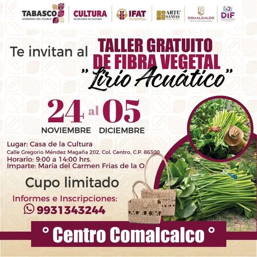 El Ayuntamiento de Comalcalco y el DIF Municipal, en coordinación con el Instituto para el Fomento de las Artesanías de Tabasco (IFAT), anunciaron el inicio del Programa de Capacitación en Fibra Vegetal “Lirio Acuático”, dirigido a personas interesadas en aprender y fortalecer técnicas artesanales.