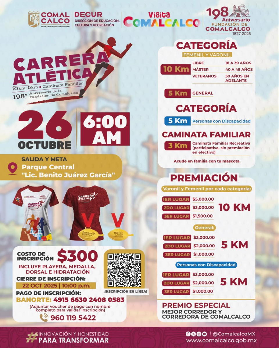 En el marco de las celebraciones por el 198° Aniversario de la Fundación de Comalcalco, el Ayuntamiento de Comalcalco, a través de la Dirección de Educación, Cultura y Recreación (DECUR) Municipal, invita a corredoras, corredores y público en general a participar en la Carrera Atlética de 10 y 5 kilómetros, así como en la Carrera Recreativa de 3 kilómetros.