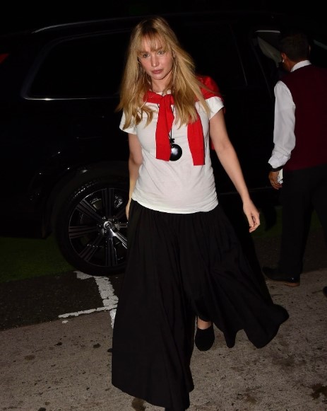 La actriz de 34 años fue vista recientemente paseando por Los Ángeles con una camiseta blanca que disimulaba su creciente barriga. Completó su look con una falda negra y un suéter rojo mientras se dirigía a una cena, lo que generó especulaciones entre sus fans y medios de comunicación.