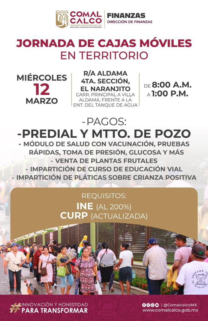 Continúan las Jornadas de Cajas Móviles en Territorio de esta semana, acercando las cajas receptoras hasta la ciudadanía para efectuar sus pagos de predial y mantenimiento de pozo, así como un módulo de salud con diversos servicios, venta de plantas frutales, impartición del curso de educación vial y del curso sobre crianza positiva.