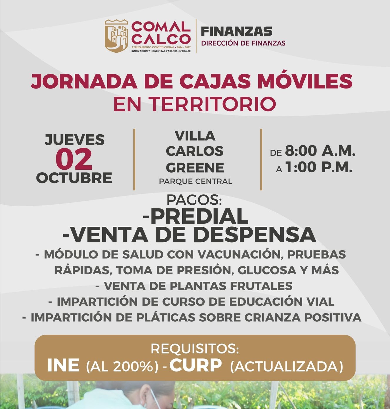 El Ayuntamiento de Comalcalco, a través de las Jornadas de Cajas Móviles en Territorio, sigue acercando sus servicios directamente a la ciudadanía, facilitando el pago de predial y agua, además de ofrecer: