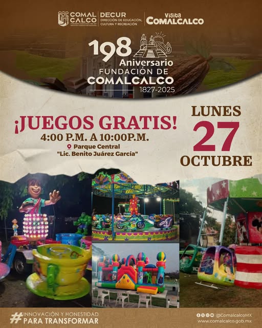 Con motivo del 198º Aniversario de la Fundación de Comalcalco, el Ayuntamiento anunció que los juegos mecánicos instalados en el Parque Central “Benito Juárez” estarán totalmente gratis este lunes 27 de octubre, en horario de 4:00 p.m. a 10:00 p.m.