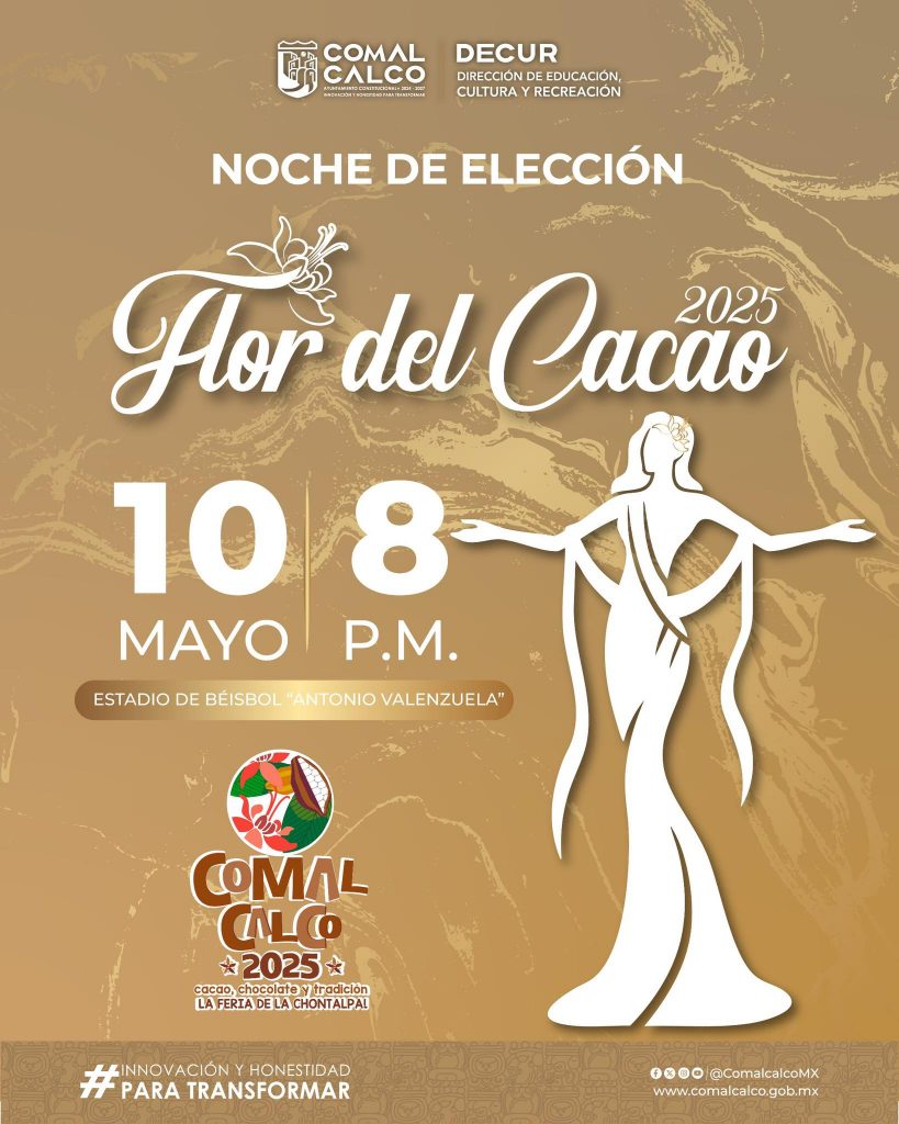 Te invitamos a asistir a la noche de Elección de la Flor del Cacao 2025, este 10 de mayo a las 8 P.M. un evento lleno de belleza, cultura y tradición que marca el inicio de nuestra gran fiesta: