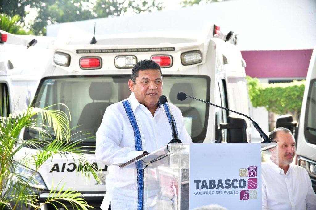 Para fortalecer el sistema de salud pública, el Gobierno del Pueblo hizo entrega de 14 ambulancias a igual número de Unidades Médicas del IMSS-Bienestar en Centros Integradores, donde se brindarán servicios de emergencia de manera inmediata y gratuita, aseguró el Gobernador Javier May Rodríguez, al dar el banderazo de salida de las unidades donadas por Petróleos Mexicanos (Pemex) a través del Instituto de la Beneficencia Pública.
