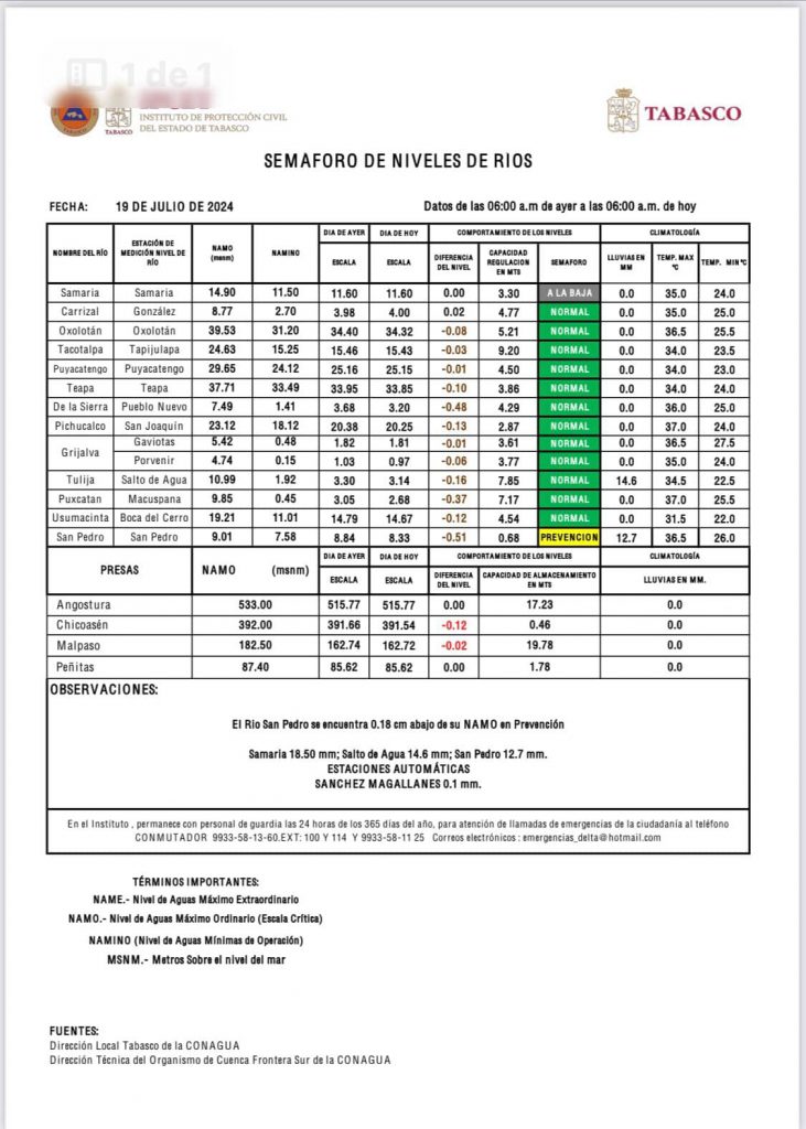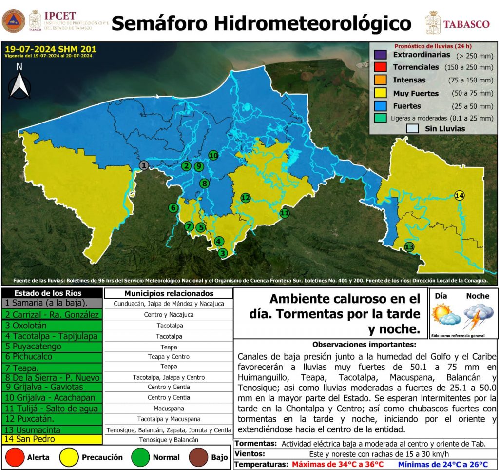 Se pronostican lluvias muy fuertes de 50.1 a 75 mm en Huimanguillo, Teapa, Tacotalpa, Macuspana, Balancán y Tenosique, así como precipitaciones moderadas a fuertes de 25.1 a 50.0 mm en gran parte del Estado.
