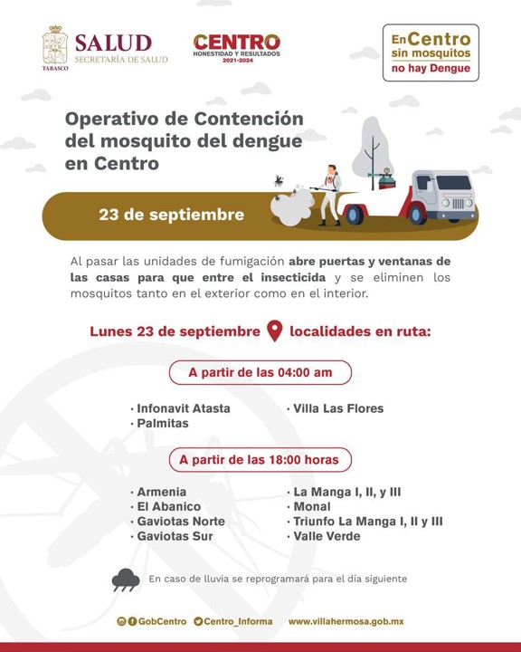 Mañana lunes 23 de septiembre, se llevará a cabo un Operativo de Contención del mosquito del dengue en el Centro.