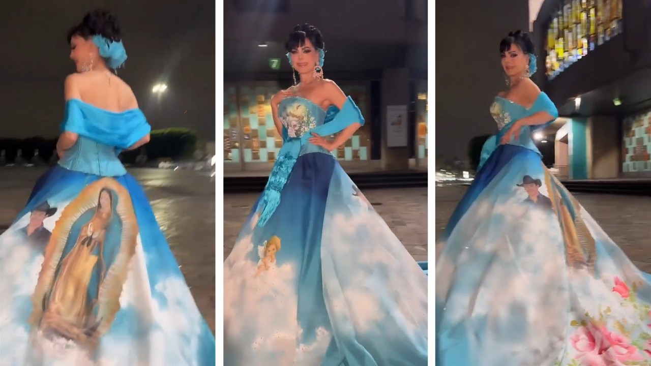 Para la ocasión, Maribel lució un espectacular vestido diseñado por Mitzy, cuya falda mostraba, pintados a mano, la imagen de la Virgen de Guadalupe junto al rostro de su hijo Julián Figueroa, convirtiéndose en un doble homenaje que unió fe y memoria.