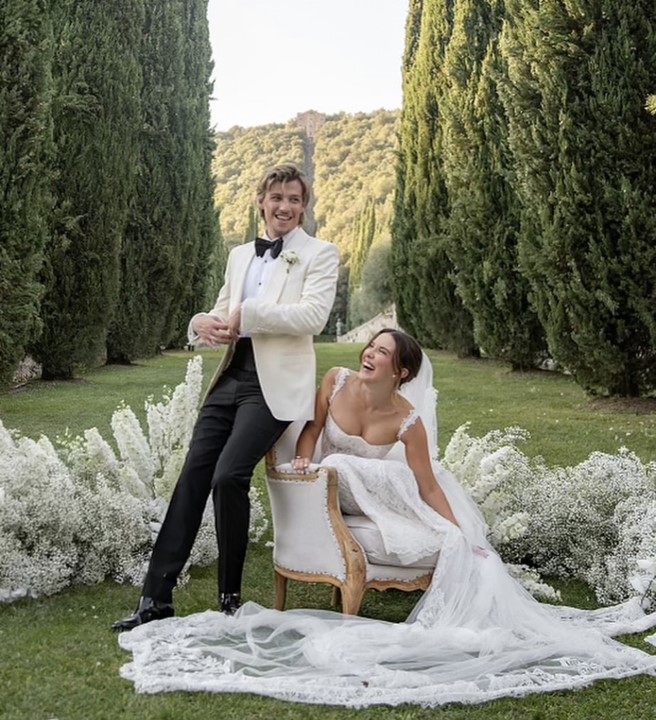 Millie Bobby Brown, con un elegante vestido de novia de encaje, dejó a sus seguidores encantados con su elección de estilo. El diseño clásico con un toque moderno resaltaba su belleza juvenil y sofisticación. Jake Bongiovi, por su parte, complementó la ocasión con un atuendo formal que incluía un saco blanco y pantalón negro, destacando por su elegancia.