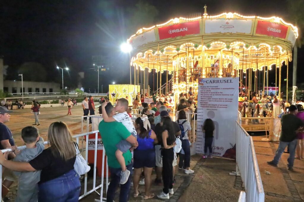 Bajo un ambiente lleno de luces, adornos y espíritu festivo, personas de todas las edades participan en presentaciones artísticas y disfrutan de las atracciones gratuitas que se han vuelto las favoritas del público, como el carrusel, el trenecito y las tradicionales piñatas, que llenan de sonrisas a niñas y niños.