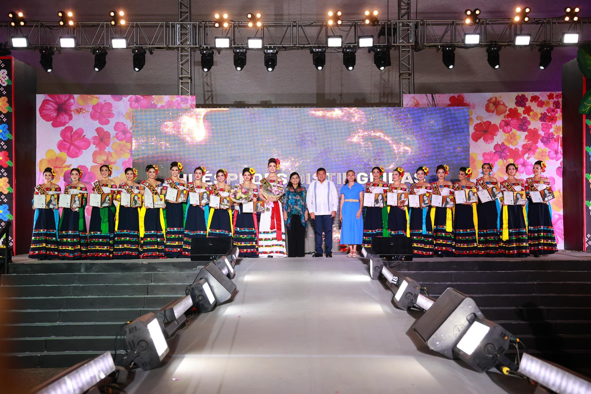 A las embajadoras, ataviadas con el vestido regional, Yolanda Osuna expuso que Villahermosa, como símbolo de anhelo compartido, resplandece hoy aún más con su presencia luminosa porque refleja el esfuerzo, el talento y el espíritu de superación que habita en las familias tabasqueñas.