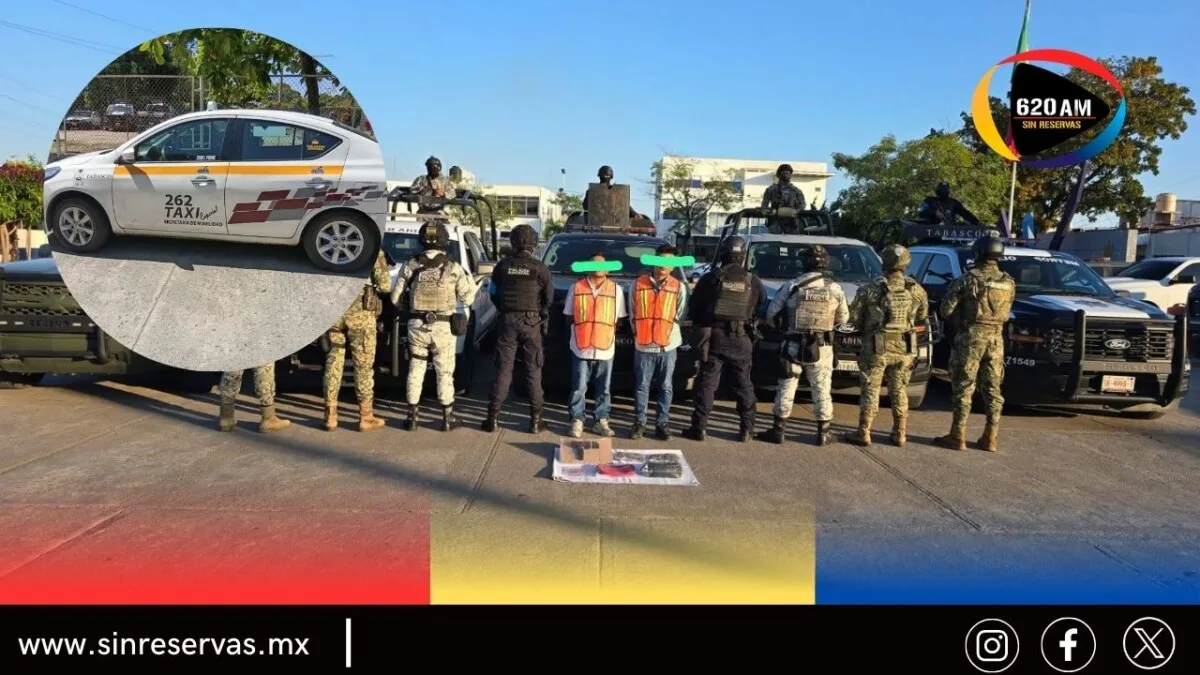 De acuerdo con el reporte oficial, los detenidos fueron identificados como José Rodrigo “N”, de 30 años, y René Domínguez “N”, alias “Medio Día”, de 41 años. Ambos se desplazaban a bordo de un taxi Nissan Versa, con número económico 262.