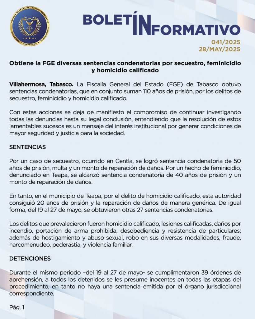 La Fiscalía General del Estado (FGE) de Tabasco obtuvo sentencias condenatorias, que en conjunto suman 110 años de prisión, por los delitos de secuestro, feminicidio y homicidio calificado.
