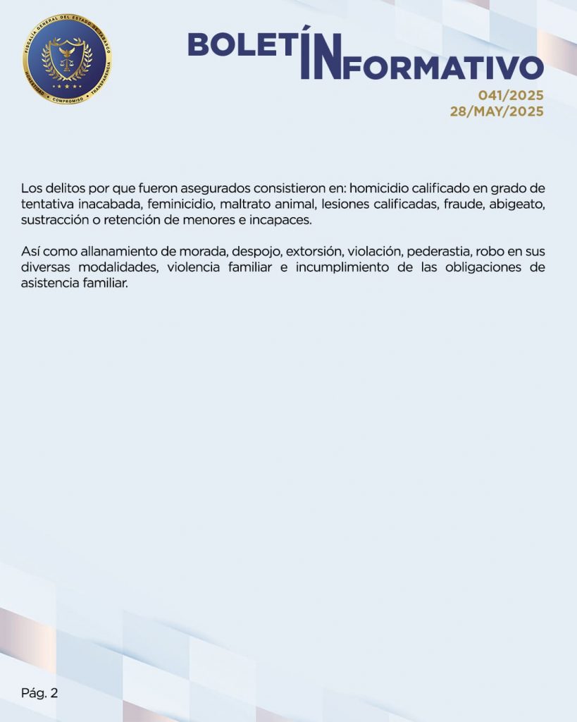 Durante el mismo periodo –del 19 al 27 de mayo- se cumplimentaron 39 órdenes de aprehensión, a todos los detenidos se les presume inocentes en todas las etapas del procedimiento, en tanto no haya una sentencia emitida por el órgano jurisdiccional correspondiente.