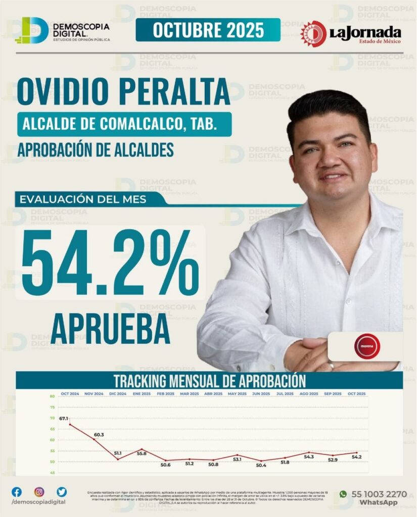 De acuerdo con la medición del mes de octubre de esa encuestadora, el alcalde de Comalcalco tuvo la mejor aprobación entre los presidentes municipales de Tabasco, con un 54.2 por ciento