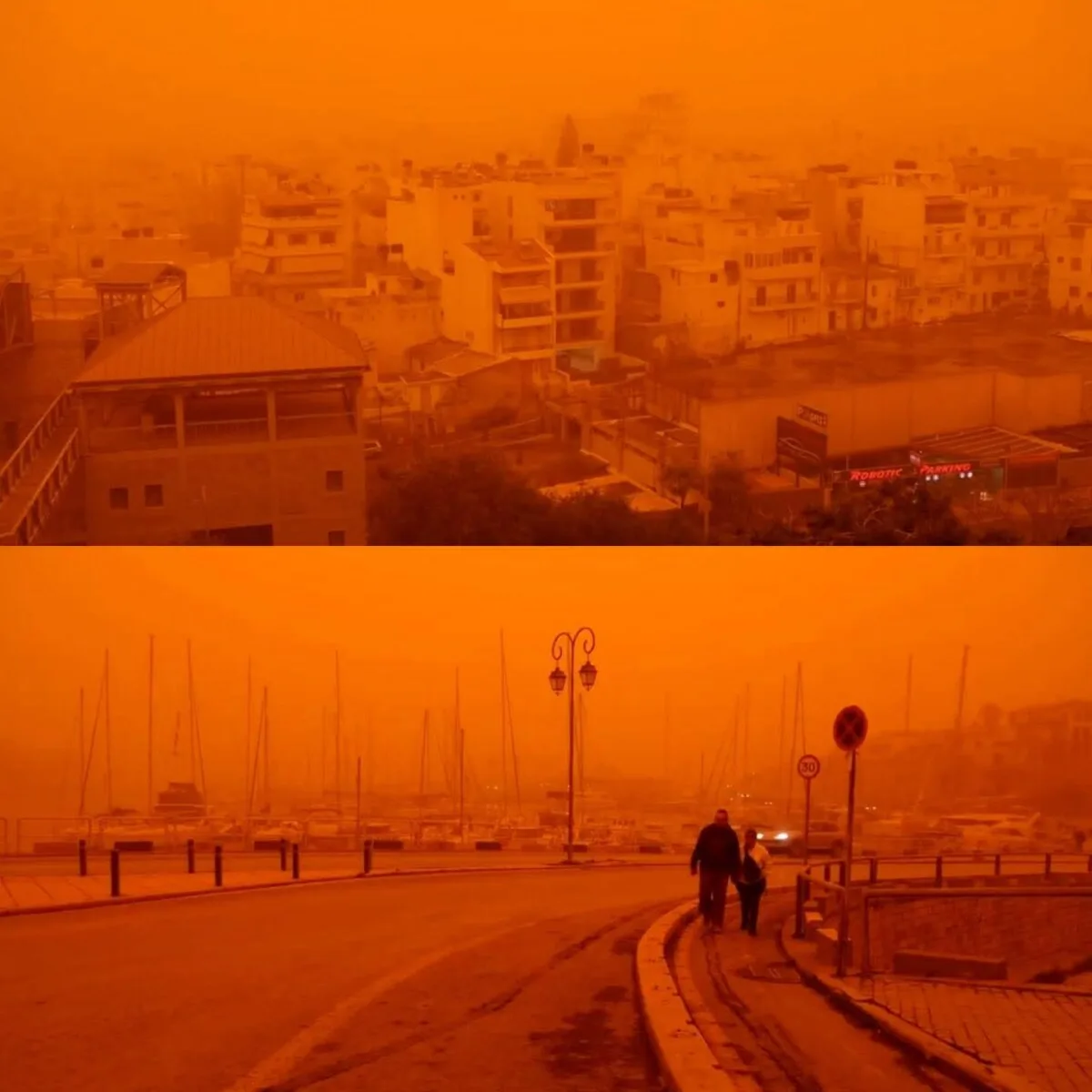 Una intensa nube de polvo proveniente del desierto del Sahara cubrió recientemente la isla de Creta, en Grecia, generando un impactante paisaje teñido de tonos anaranjados y rojizos.