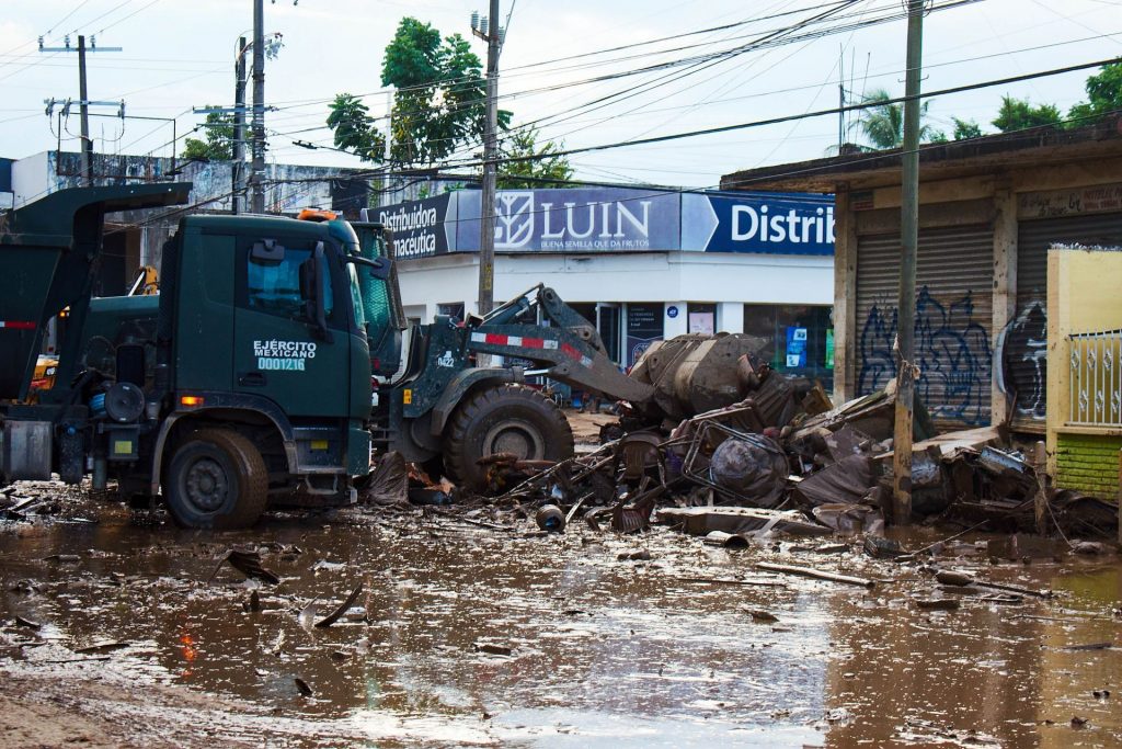 Toneladas de lodo son retiradas de viviendas, calles y establecimientos comerciales en Poza Rica, Veracruz, luego de las severas inundaciones provocadas por el desbordamiento del río Cazones, a consecuencia de las intensas lluvias registradas el pasado viernes.
