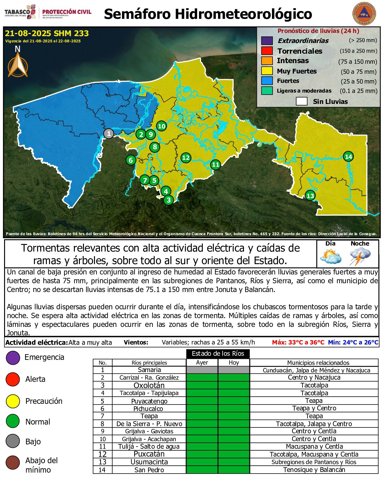 La presencia de un canal de baja presión, junto con la entrada de humedad al territorio tabasqueño, propiciará precipitaciones de fuertes a muy fuertes, con acumulados de hasta 75 milímetros, principalmente en las subregiones de Pantanos, Ríos y Sierra, además del municipio de Centro.