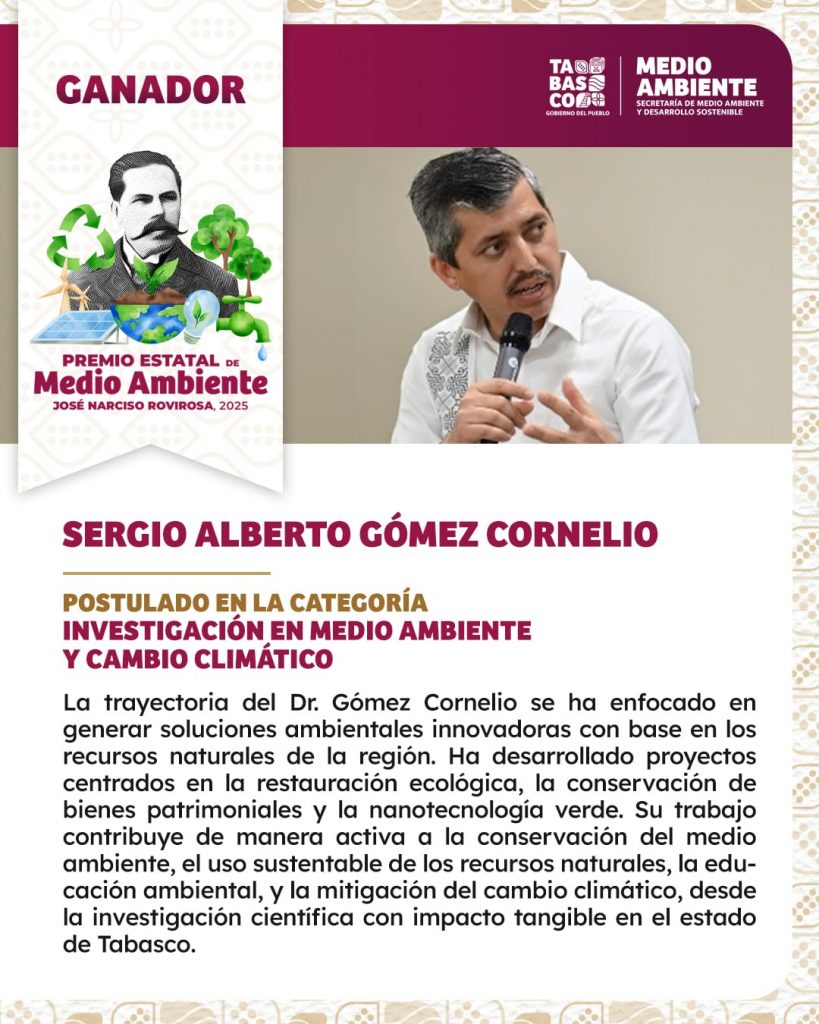 • Sergio Alberto Gómez Cornelio, en la categoría ‘Investigación en Medio Ambiente y Cambio Climático’