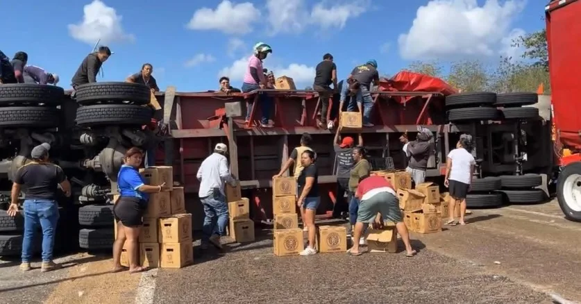 Un tráiler de doble remolque que transportaba cervezas fue objeto de rapiña este martes a la altura de San Francisco Kobén, en dirección hacia el estado de Campeche, lo que provocó el cierre total de la vialidad.