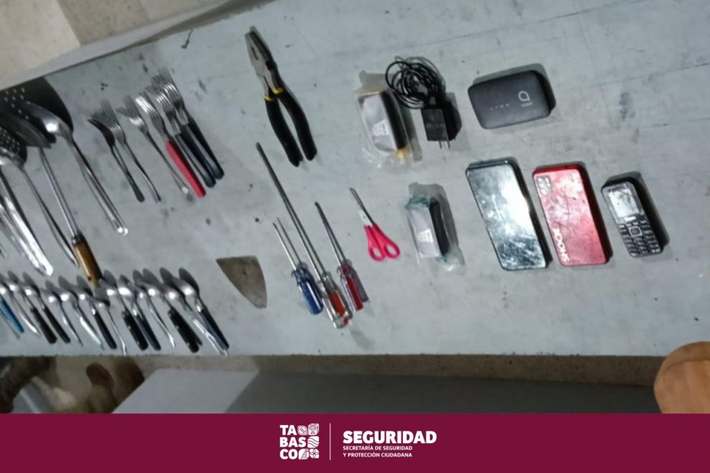 Durante la revisión por diversas áreas del CREST, se decomisaron 3 teléfonos celulares, un módem, una repisa doble fondo, 2 vapeadores, 1 cargador para celular, tijera, 1 pinza de corte tipo electricista, desarmadores, 6 tenedores metálicos, cucharas y cucharones metálicos, así como otros artículos de cocina que se podrían considerar de riesgo.