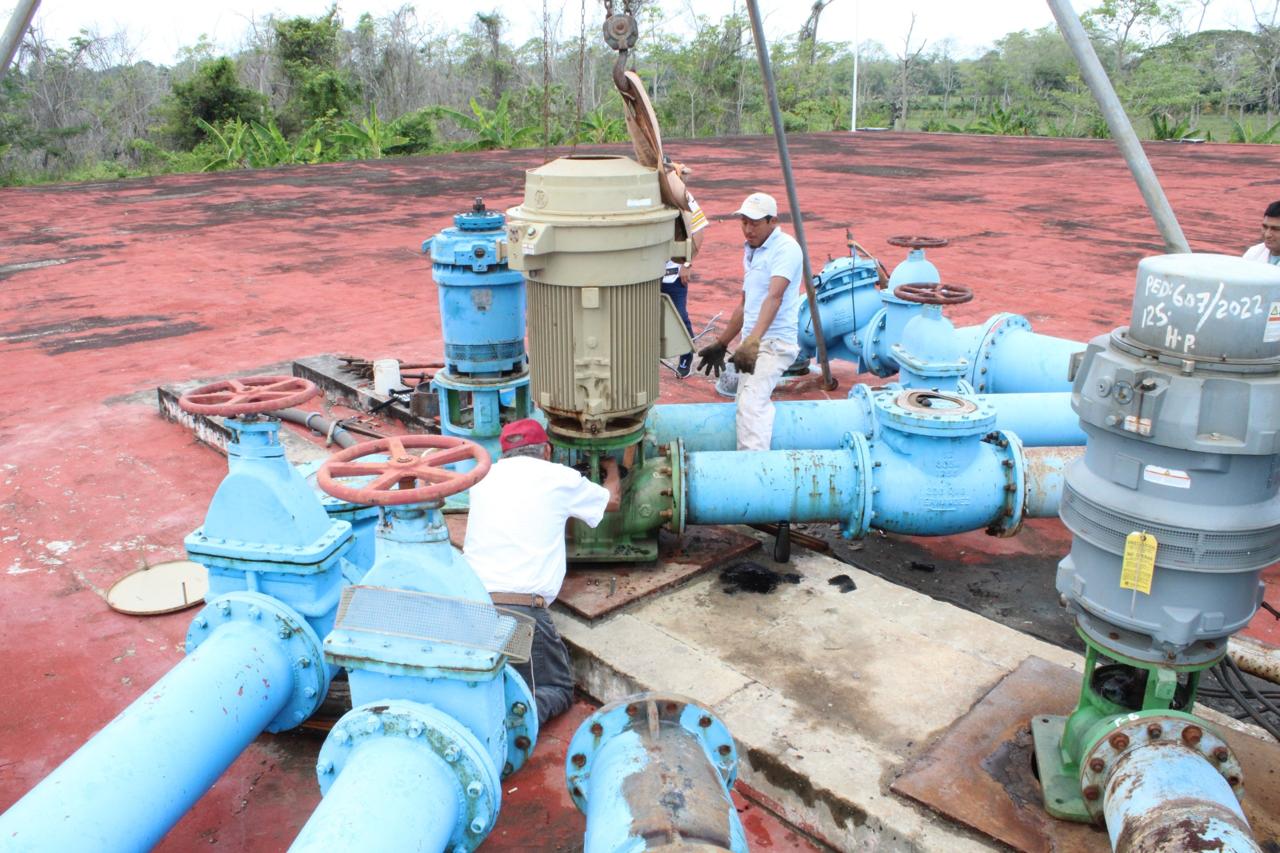 Una cuadrilla de la DOMCCA cambió de equipo de bombeo en esta infraestructura hidráulica que recibe el vital líquido de la Planta Potabilizadora El Mango y lo distribuye a Comalcalco y Paraíso