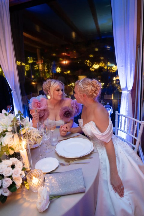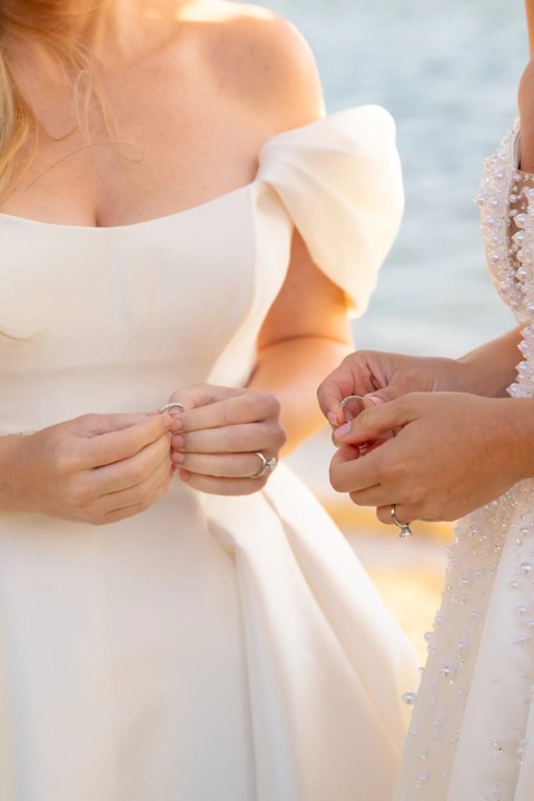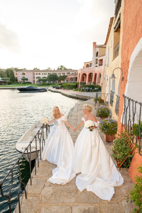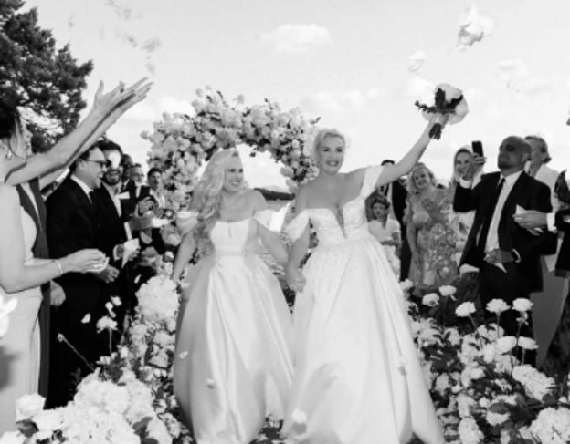 La ceremonia, que tuvo lugar en septiembre, fue una celebración íntima con la familia y amigos más cercanos de la pareja. Ambas novias lucieron vestidos de Pronovias: Rebel con un estilo princesa en tejido Mikado y escote palabra de honor, mientras que Ramona optó por un vestido de línea A con un escote corazón. La boda estuvo llena de detalles encantadores, como el intercambio de votos escritos por ellas mismas, la participación de su hija Royce como niña de las flores, y una banda en vivo de 20 músicos tocando durante la recepción.