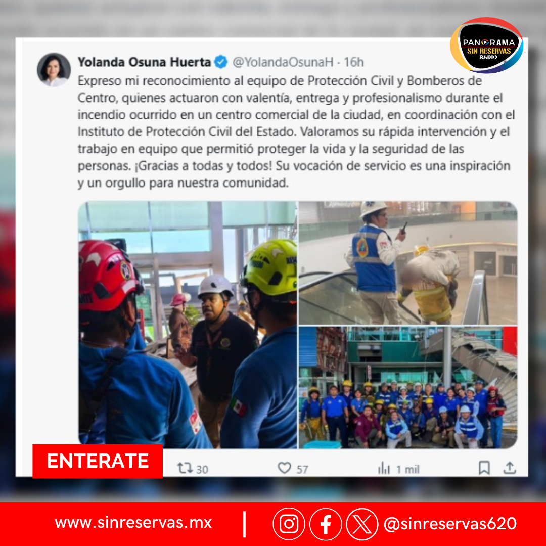 La alcaldesa de Centro, Yolanda Osuna Huerta, expresó su reconocimiento al equipo de Protección Civil y Bomberos de Centro, quienes actuaron con valentía, entrega y profesionalismo durante el incendio registrado ayer en un centro comercial de la ciudad.