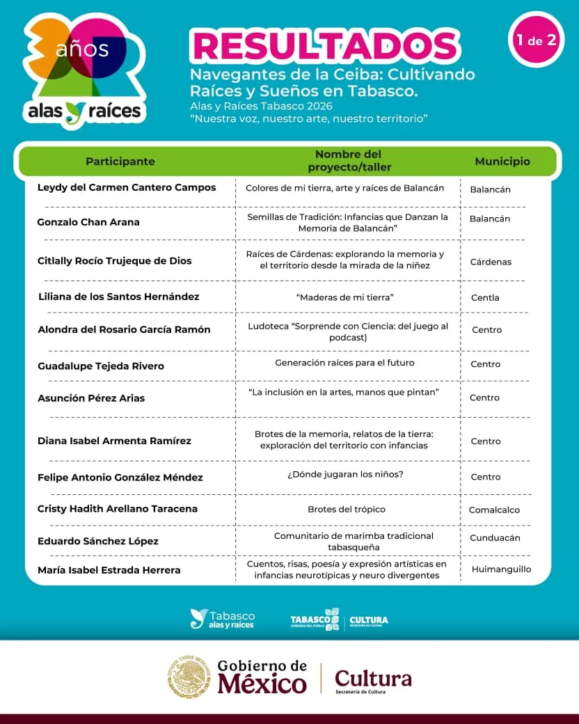 Villahermosa, Tabasco.– Como parte de las acciones para fomentar el desarrollo cultural desde las infancias y juventudes, el Gobierno del Estado, a través de la Secretaría de Cultura, dio a conocer los resultados de la convocatoria “Navegantes de la Ceiba: Cultivando Raíces y Sueños en Tabasco”, Alas y Raíces Tabasco 2026.